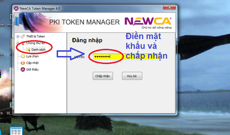 - Bước 3: Đăng nhập vào thiết bị Chữ ký số bằng mã pin đã đăng ký;