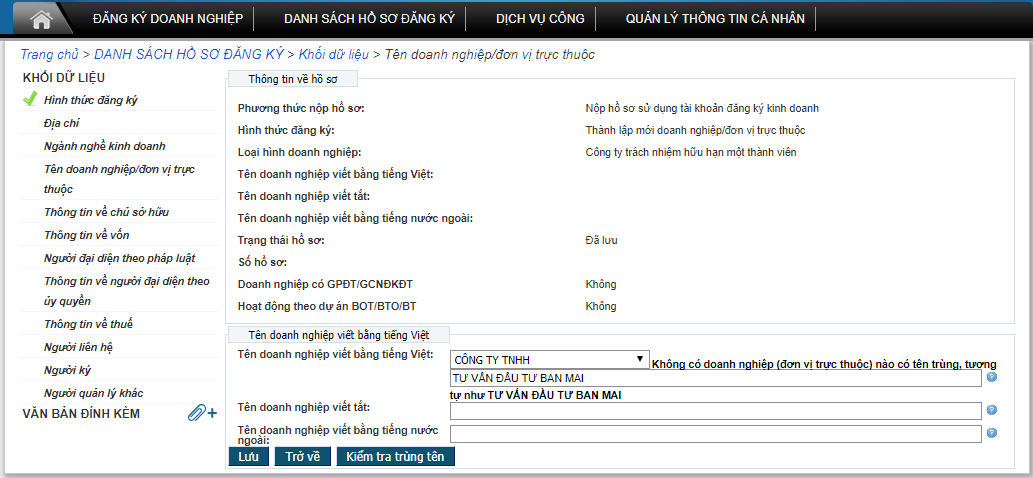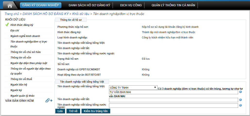 Bước 3: Chọn phần Tên doanh nghiệp/đơn vị trực thuộc theo hình và gõ tên công ty dự định thành lập và chọn kiểm tra trùng tên. Kết quả có thể là trùng hoặc không trùng theo ảnh sau
