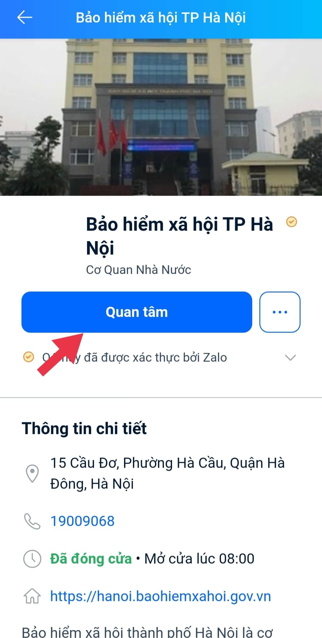 Bước 2: Đầu tiên, vào tìm kiếm, tìm và chọn Cơ quan Bảo hiểm nơi bạn tham gia Bảo hiểm thất nghiệp.-> Chọn Quan TâmBước 3: Nhấn vào biểu tượng góc trái, chọn Bảo hiểm thất nghiệp