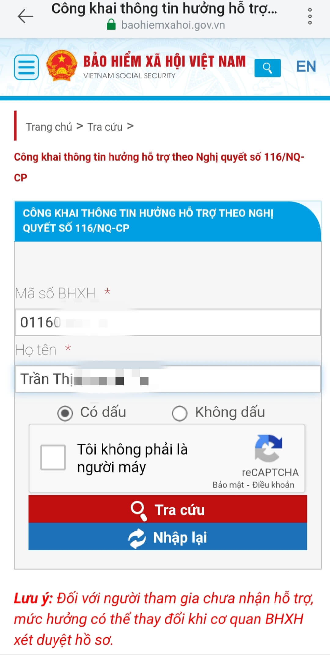 Hướng dẫn tra cứu tiền hỗ trợ theo Nghị quyết 116