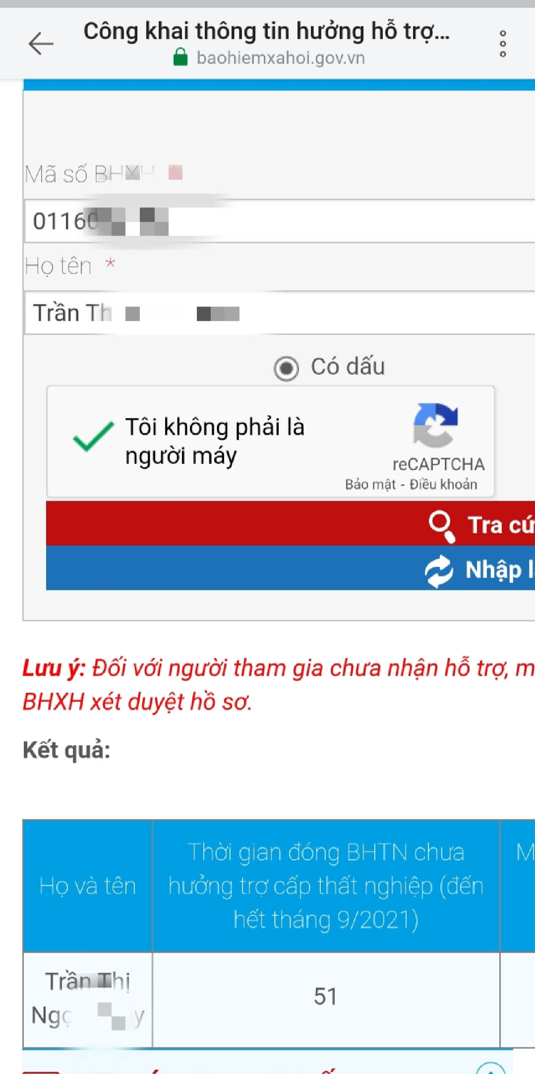 Sau đó, điền chính xác thông tin về mã số BHXH, tên (có dấu hoặc không dấu) xác nhận “Tôi không phải là người máy” và chọn “Tra cứu”.