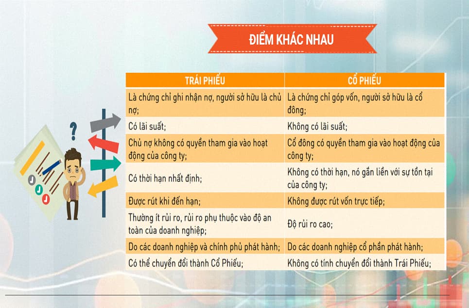 Lợi nhuận do cổ phiếu mang lại sẽ lớn hơn nhưng đi kèm với đó là mức độ rủi ro. Trái phiếu có mức độ rủi ro thấp hơn vì lãi suất cố định và họ thường có lợi nhuận thấp hơn.